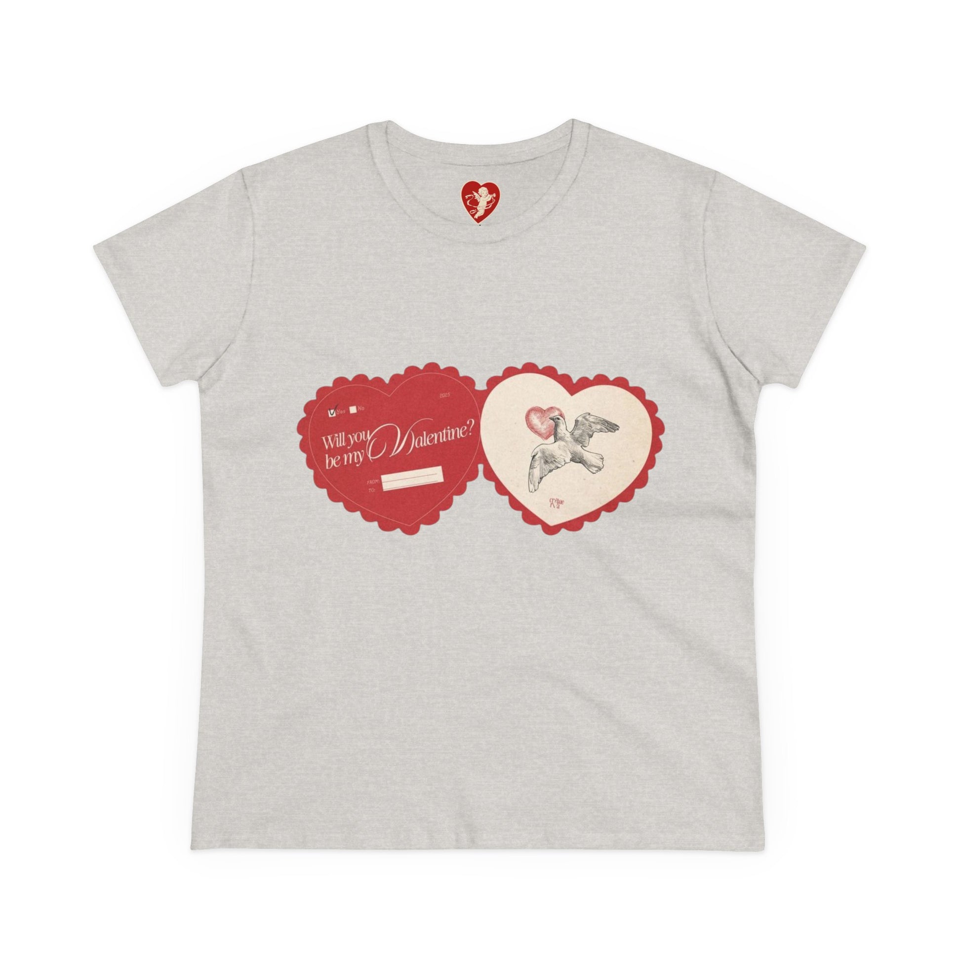 This midweight cotton tee brings vintage Valentine charm into everyday wear. Soft, slightly fitted, and breathable, it features two scalloped-heart graphics—one with a faded cherub and the other with space to personalize—printed on a clean white base. Wear it on casual coffee dates, nostalgic photo walks, or layered under a cardigan for cozy evenings. The fabric drapes nicely without clinging, and the tear-away label keeps the neckline comfortable for long days. It reads like a warm note folded into your outfit, a quiet way to carry a personal memory or sentiment with you.